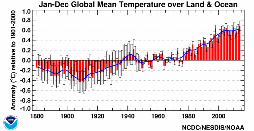 Der rekordartige Anstieg von CO2 hat dafür gesorgt, dass unser Planet bereits begonnen hat, sich zu erwärmen. Die nachfolgende Grafik zeigt die gemessenen Temperaturanomalien seit dem Jahre 1880. Seit rund 30 Jahren befindet sich die globale Mitteltemperatur nun schon über dem Durchschnittswert von 1901 bis 2000.