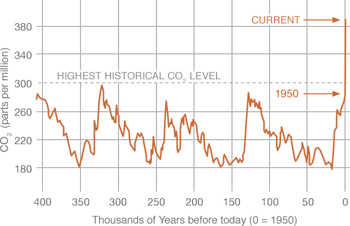 Hunderttausende Jahre alte Luftblasen, die in Eisbohrkernen erhalten bleiben, erlauben es uns, frühere CO2 – Konzentrationen zu messen. Seit etwa 1950 steigen die CO2 – Konzentrationen in einer besorgniserregenden Geschwindigkeit an und pulverisieren geradezu vergangene Höchstwerte. Aber woher wissen wir nun, ob das CO2 menschlichen Ursprungs ist? Wissenschaftler können jene Masse an CO2 messen, die durch die Verbrennung fossiler Energieträger emittiert wird. Diese wird dann der ausgestoßenen Menge an CO2 aus natürlichen Quellen gegenübergestellt. Der Vergleich zeigt, dass ein Großteil der Konzentrationen menschlichen Ursprungs ist.