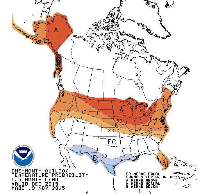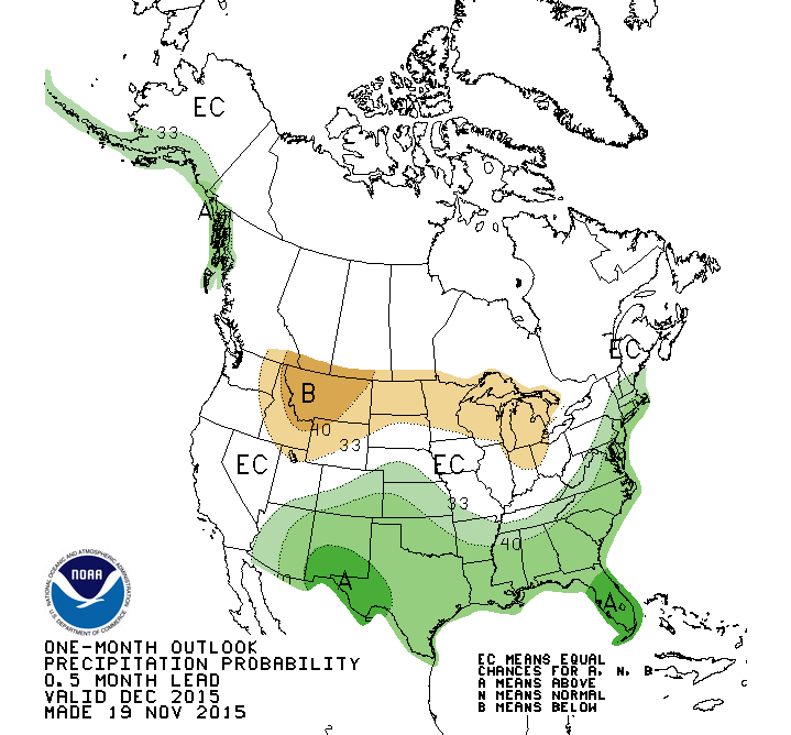Turning to the prospects for US resorts in the next few weeks, a few solid storms have enabled some resorts to give skiers an early taste of the ski season. The Aspen-Snowmass resort partially opened on 14-November, and is scheduled to open fully on 21-November, five days ahead of schedule. The U.S.Climate Prediction Center’s outlook for the next month (see figures below) would suggest near-normal precipitation and temperatures across many of the resort-dense ranges from Colorado through Utah to California through December. The major resorts in many of these areas saw near to above normal snowfall totals for the winter of 1997-98, the last time the El Nino reached the strength it currently enjoys, however above-normal temperatures associated with strong El Nino events could push snow levels higher than normal, spelling trouble for smaller resorts at marginal elevations.