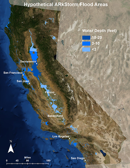 Of course this is rare, with such an extreme situation statistically occurring once every couple hundred years. Nonetheless, the threat for the future is very real. As such, the US Geological Survey created a fictional, though realistic, simulation in which the event was called ARkSTORM. The conclusions drawn were astonishing. Based on the simulation, damage from the ARkSTORM could reach $725 billion, which is three times higher than estimated damages caused by “the big one” earthquake. The simulation found a quarter of all buildings in California would be damaged by flooding, and insurance costs would be permanently pushed higher. Luckily, unlike earthquakes, this type of event can be reasonably predicted over a week in advance. Weather models keep getting more powerful and forecasts of extreme events are improving. Whether it’s an ordinary Pineapple Express or the next Great Storm, it will not be a complete surprise.