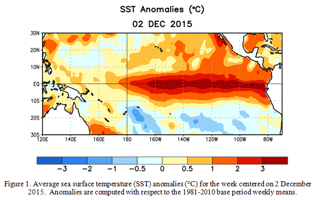 Weather headlines across the globe in the second half of 2015 were dominated by a steadily intensifying El Nino, the abnormal pooling of warm water off the Pacific coast of northern South America. Water temperatures have been running an astounding 3-4°C above normal there, leading to values of the ONI (Oceanic Nino Index, one of several standard measures of El Nino intensity) that place this event in the top three strongest El Ninos of all time, alongside the notoriously stormy winters of 1982-83 and 1997-98. While El Nino can wreak havoc on weather patterns around the world, some of the impacts can actually be beneficial. For instance, the Atlantic hurricane season was unusually quiet thanks to El Nino, pushing the streak of seasons without a strike on the US mainland from a major hurricane past a decade. There is also hope for some drought relief in California.