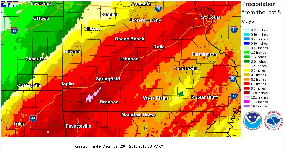 An unusually strong and persistent winter storm pounded the central U.S. with rain and wintry precipitation for three days starting on December 26th. By December 28th, a wide swath of Missouri and Illinois had picked up at least three inches of rain, with 6-12 inch totals extending along the I-44 corridor (see Fig. 1). According to the National Weather Service, the three day rain total of 9.80 inches in St. Louis was more than enough to push 2015 to the top of the record books as the wettest year on record for the city with 61.24 inches of water (the previous record was 57.96 inches in 2008). It was by far the wettest December ever recorded in St. Louis with 11.74 inches of rain, blowing past the old record of 7.82 inches in December 1982.