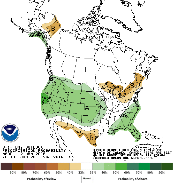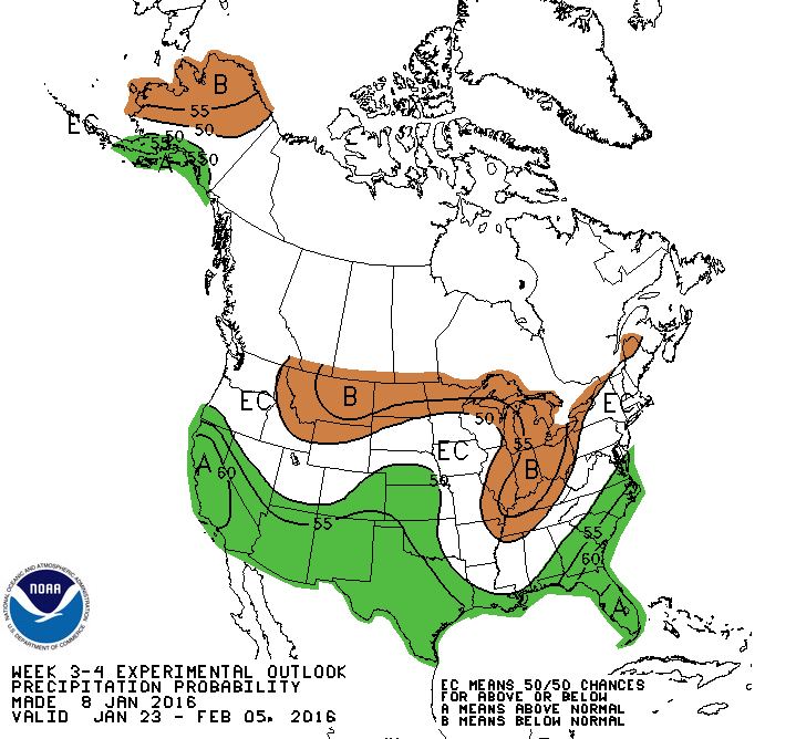 Evidence suggests that the current El Niño has just passed its peak intensity but is likely to remain in the warm phase through the next several months, meaning opportunities for additional drought alleviation in California. One or two hard-hitting if short-lived storms have made headlines recently after causing significant flooding in some of the prominent West Coast cities, but much of central and southern California remains in the “Exceptional” (most severe) category of drought, a calamity going on two years in duration that has decimated the water supply and led to severe restrictions on water use. However, the storm track that has thus far favored the Pacific Northwest is expected to shift further south over the next few weeks (see CPC precipitation outlooks in figure three, for week two, and figure four, for weeks 3-4), potentially targeting the most drought-stricken portions of California. A succession of winter storms could produce not only much-needed rainfall over the valleys but heavy snows in the Sierra Nevada range, fortifying the snowpack that’s already running near normal, a far cry from last season when many snow-starved resorts simply couldn’t open. If this snowy pattern unfolds as expected it’ll be to the delight of not only skiers and snowboarders now but also farmers in the valleys below that depend on abundant snowmelt water for the growing season that begins as the ski season is coming to an end.