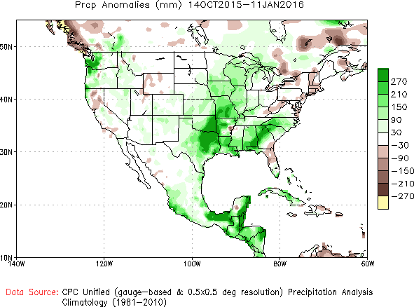 will prove beneficial. This kind of storminess and above-normal precipitation in the West and South matches forecasts based on strong El Niños, such as the one we’re experiencing now, which tend to lead to a more active subtropical jet stream transporting abundant Pacific moisture into the United States. Sea surface temperatures over the tropical Pacific remain several degrees above normal over a vast area of the ocean, as indicated by the unexpected development of Hurricane Pali, the earliest hurricane ever to form in the Central Pacific. Pali will threaten land masses with little more than somewhat elevated surf, but it’s an impressive sign of El Niño’s influence.