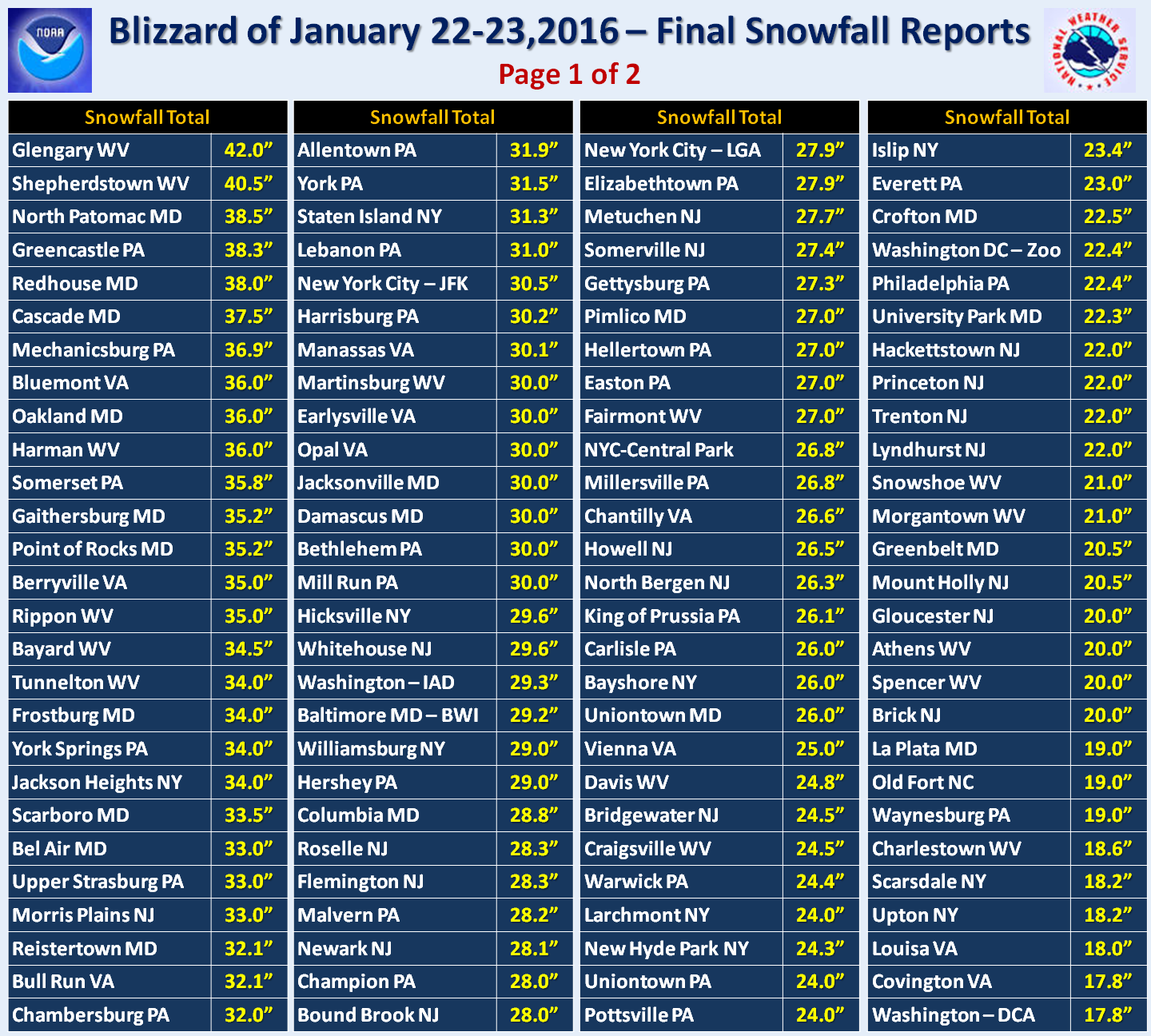 Philadelphia and southeastern Pennsylvania observed over 20” (50 cm) of snow for much of the region, with Philadelphia recording it’s 4th largest snowfall on record at 22.4” (56.9 cm). SEPTA and New Jersey Transit service was suspended during the storm and are slowly beginning operation throughout the day Sunday.
