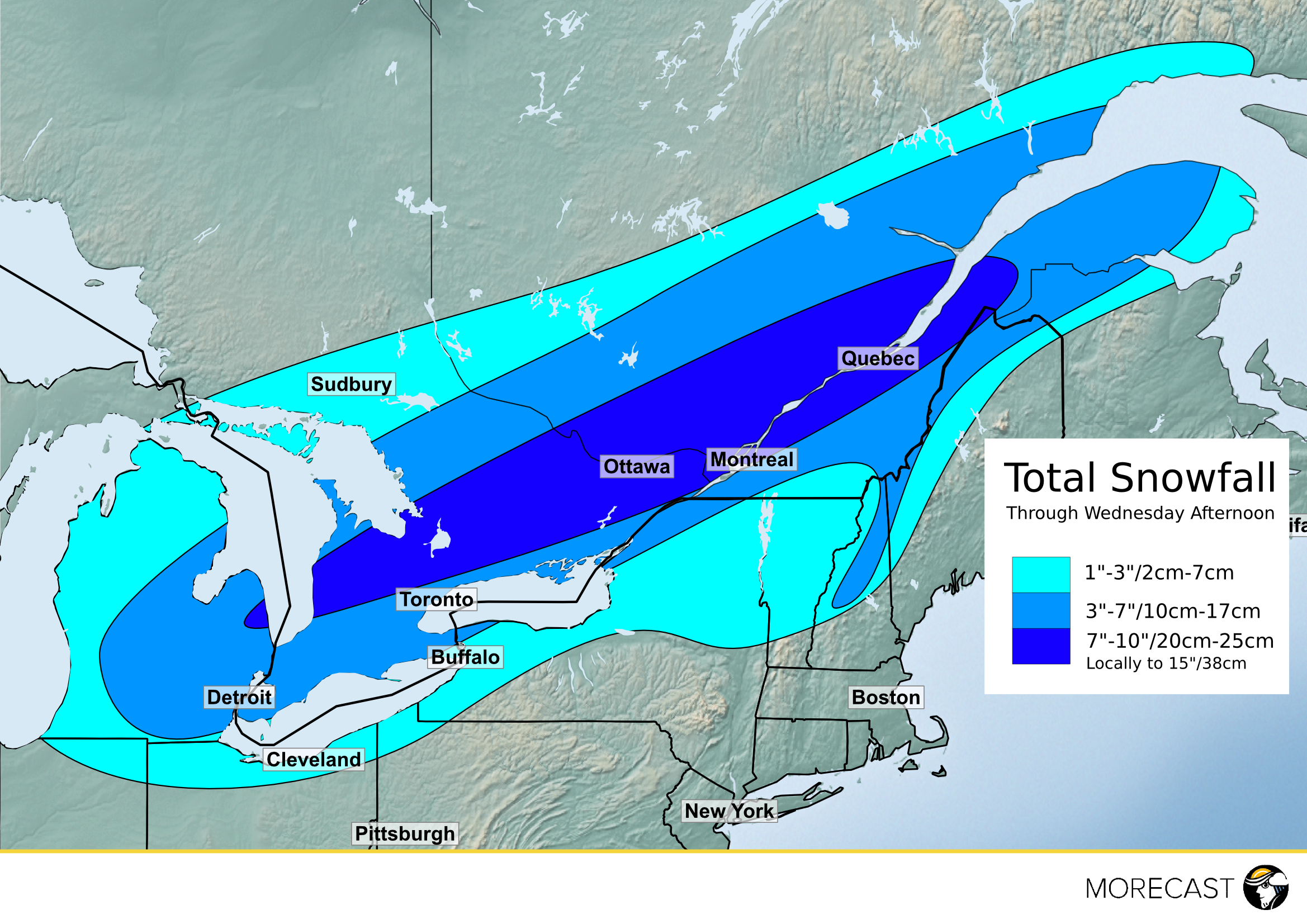 This system is somewhat dependent on a band of very heavy snow along the back side of the surface low pressure. The exact placement of the heaviest snow band is still somewhat uncertain but current model guidance suggests that it will set up somewhere north of Toronto and extend very near to Ottawa, Montreal, and Quebec City. Toronto itself will likely see 15-20cm with heavier snow to the north. Ottawa will be the hardest hit and can see 20-25cm, but is within possibility of having banding set up that could bring closer to 40cm. By morning tomorrow the snow will be affecting Montreal, and there will likely be a sharper gradient of snow accumulation right along the St. Lawerence River, though 20-25cm is quite possible for the city itself. Snow will likely continue through most of the day Wednesday for Quebec City with a grand total of 20-25cm possible by Wednesday night.