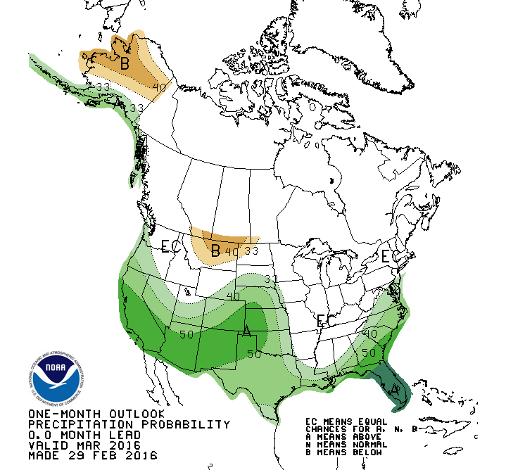 While much of the northern U.S. looks to enjoy a mild spring, the southern half of the country appears on track for above average precipitation (Map 2.). The typical moisture-laden air masses pushed inland during El Nino years will continue to impact the region as they have done for months now, with New Mexico and the surrounding areas most likely bearing the brunt of the extra moisture. Florida and coastal areas of the Southeast also look set for some extra rainfall in the coming months, though with a lesser chance outside of central and southern Florida.