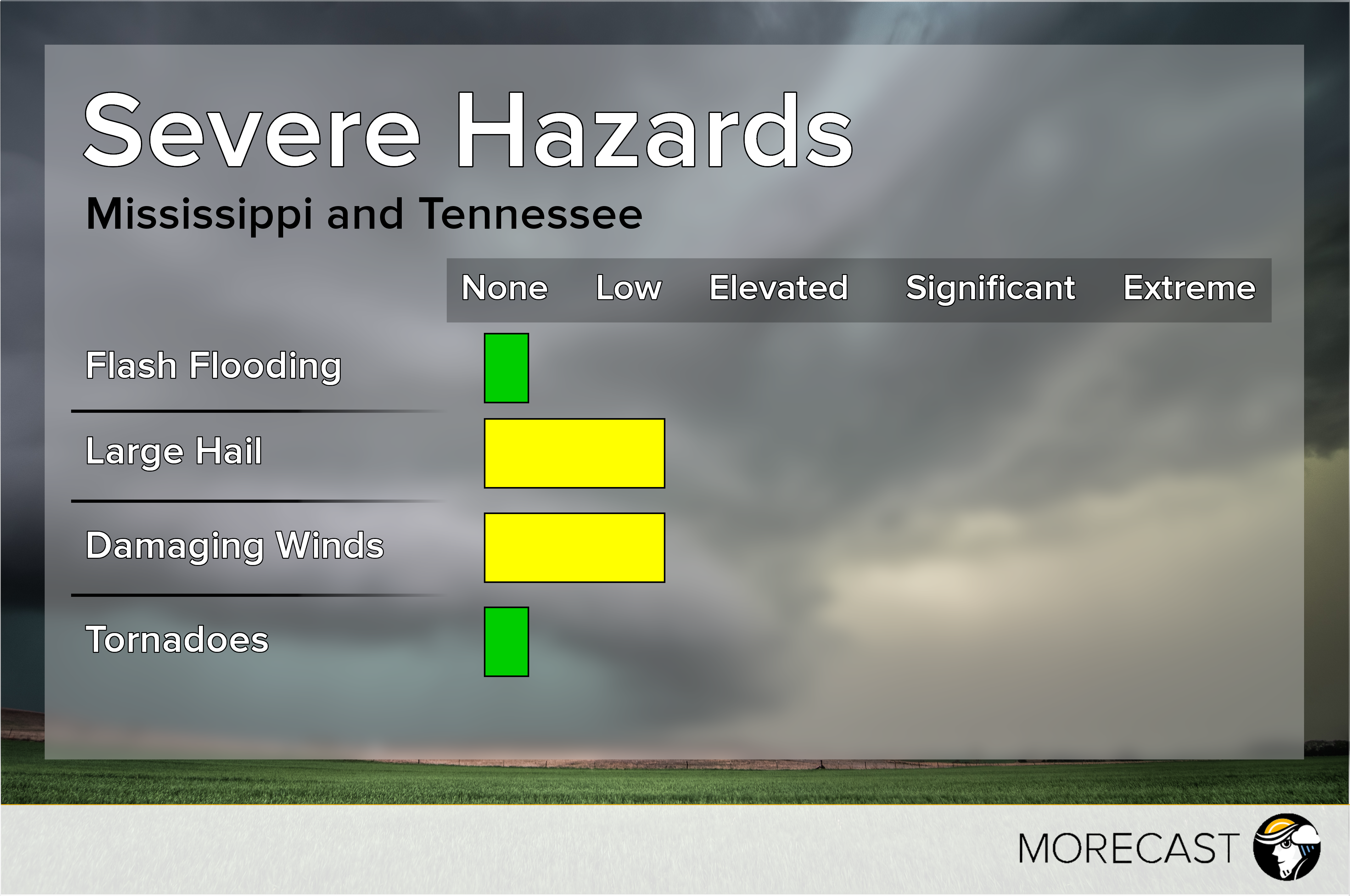 Being further from the center of the low, storms will have a harder time intensifying in Middle and West Tennessee along with northern Mississippi even as the cold front passes through. The primary threat for any storm that does form will be hail and potentially severe winds. Tornadoes are not likely with these storms.