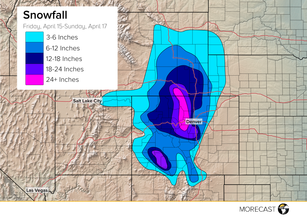 After a brief taste of some spring-like weather earlier in the week, temperatures will drop quickly as we head into the weekend. The colder temperatures will be the least of residents’ worries as a slow moving system in the upper atmosphere will bring heavy snow to much of Colorado, southern Wyoming and portions of the High Plains, dropping up to 2 feet of snow in some areas. Major travel delays, dangerous roads and power outages will impact major cities across the Plains and the Rockies, such as Denver, Colorado Springs, and Cheyenne. MORECAST provides an up-to-date forecast for the winter storm with details on who can expect the worst of the storm this weekend.