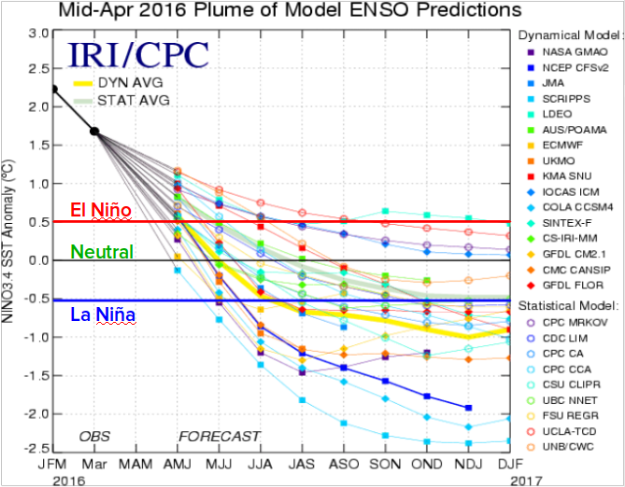 After this year’s El Niño reached it’s peak strength in November of 2015, ocean temperatures began to steadily decrease. Recent temperatures are indicative that the current El Niño will come to an end by early summer and enter a neutral stage. What happens after is the big question. Will we remain in the neutral area or will temperatures continue to decrease into La Niña conditions?