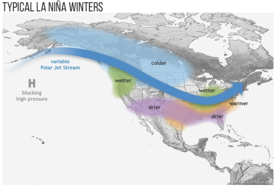 During the winter months, La Niña shifts the typical pattern of the jet stream. Because of the shift, the Pacific Northwest typically sees above average precipitation, as do portions of the Great Lakes and the Ohio River region. Alaska, western Canada and the central North US experience colder temperatures and in the South, conditions are much drier and warmer than normal. With below normal precipitation in California, drought conditions could worsen. However, it’s important to remember that La Niña only increases the chance of certain deviations from normal conditions. In other words, places like California could still see near or even above average rainfall, despite La Niña decreasing that likelihood.