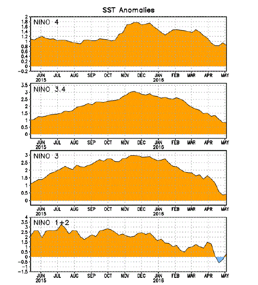 However, all signs are pointing to this El Nino phase coming to a rapid end. The above average sea surface temperatures in the central and eastern equatorial Pacific Ocean that make up El Nino have all shown signs of cooling off below levels needed to be classified as such. However, those required levels use averages over a three month period, so El Nino has not been officially declared over just yet, but it’s getting close. It’s expected the eastern Pacific and resulting atmospheric patterns will fully return to a neutral phase in the next couple of weeks.