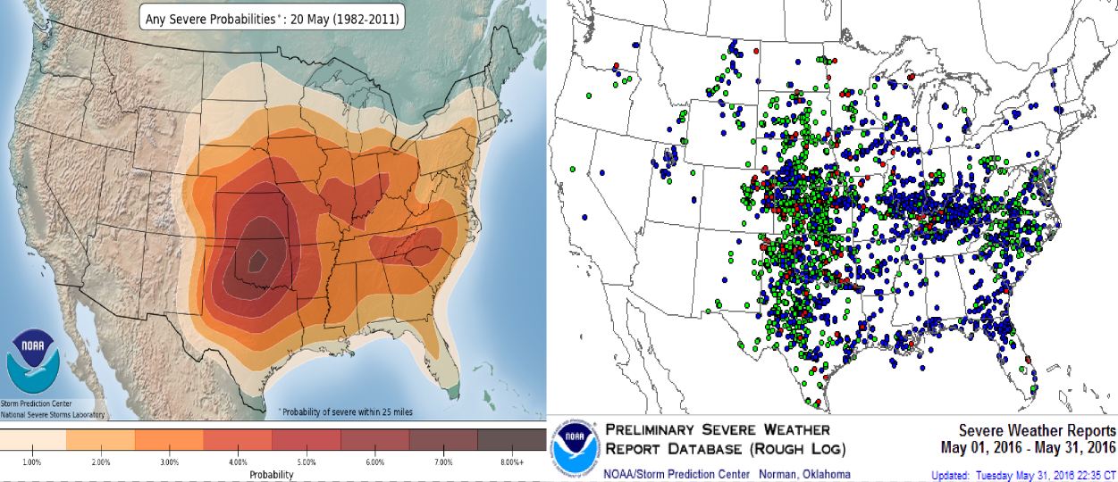 When it comes to severe thunderstorms, May 2016 turned out to be an active, but seasonable month. A total of 42 states had at least one severe weather report, which are storms that produce one of or a combination of the following: a tornado, one-inch diameter hail or larger, and damaging winds of 58 mph or higher. The highest concentration of severe weather reports were in the central and southern Great Plains, with another batch throughout much of the Ohio River Valley extending east into Appalachia in Virginia and North Carolina. These concentrations correspond quite well with the 30-year probabilities of the daily severe weather risk in the middle of May (see figure below).