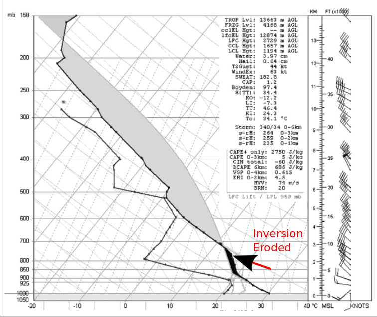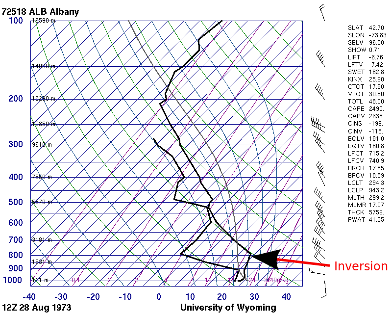 Two soundings below show an example of an EML evolution during the day. The first figure shows a sounding on the morning of August 28th, 1973 in Albany, NY. In the sounding, an inversion and capping are present which prohibits storm development. Also, an abundance of low level moisture is present with increasing dewpoint.