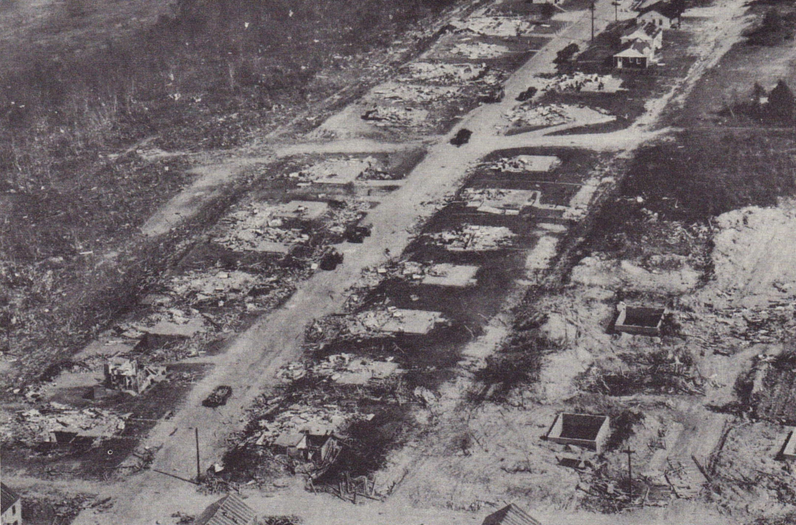 The tornado lasted until about 5:45 PM. Unfortunately, no tornado warnings were issued on the storm until it had dissipated over Framingham, Massachusetts. The storm traveled almost 50 miles and was on the ground for nearly 90 minutes. Officially, 90 people were killed with an additional 1,000+ injured. The tornado caused more than 50 million dollars in damage at the time, equivalent to 500 million dollars today. It also set a record for leaving more than 10,000 people homeless. The Worcester tornado left a historical mark on the United States by leading to the reorganization of what is now the Storm Prediction Center. It also led to the implementation of a nationwide radar/storm spotter system. Since June 9th, 1953, the results of the new changes were proven to be successful as no U.S tornado killed more than 100 people until May of 2011 when Joplin, Missouri was hit. Once all the damage had been surveyed, the NWS determined that the Worcester tornado was classified as an F4 on the Fujita Scale which was developed in 1971. According to this scale, the Worcester tornado received second highest rating with a storm having estimated wind speeds between 207 and 260 mph. Below is a photo that depicts damage done to a neighborhood while the tornado was at peak intensity.