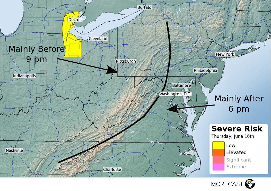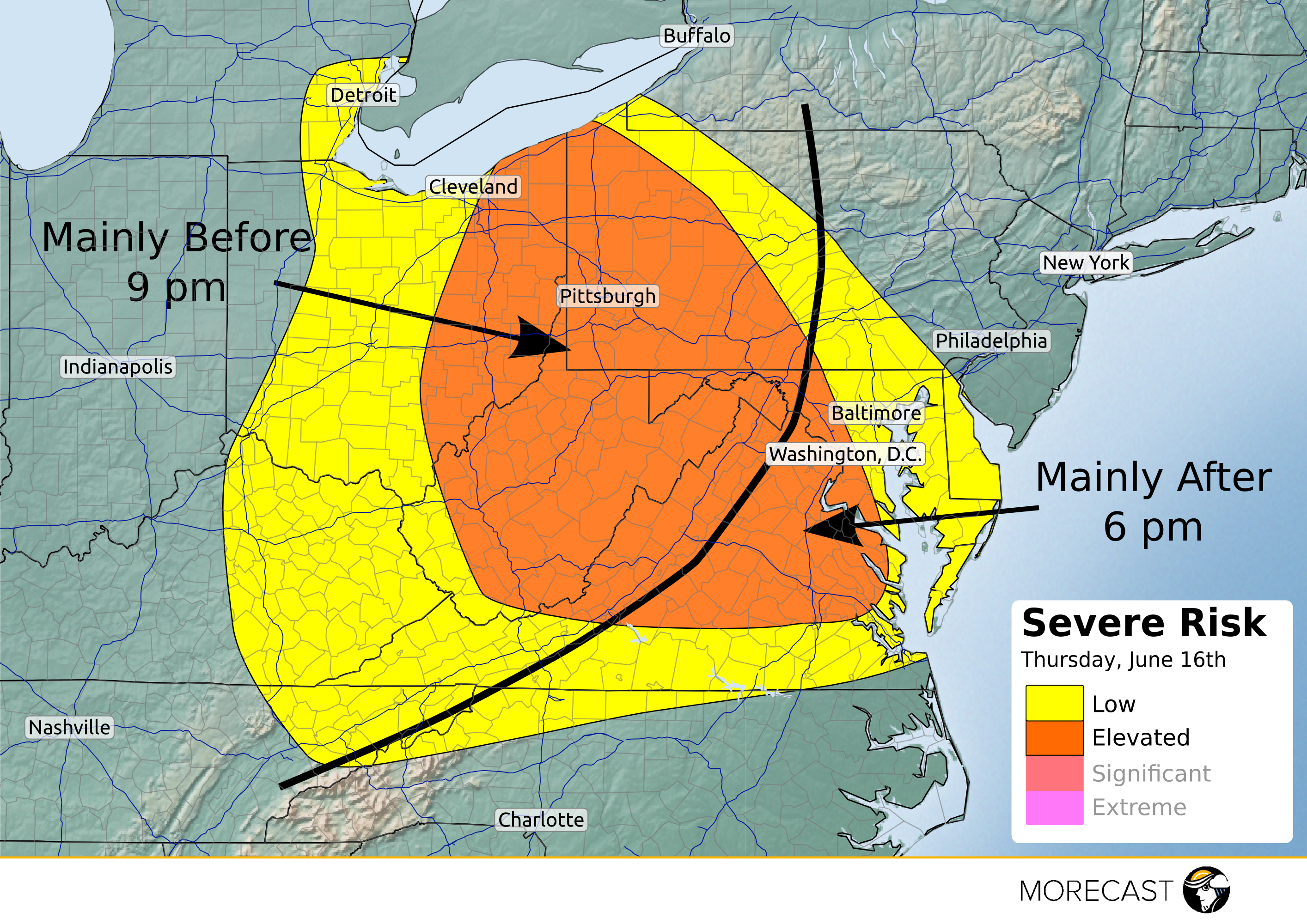 Pittsburgh, Pennsylvania and Morgantown, West Virginia are a couple of cities that are under the gun for potentially damaging thunderstorms this afternoon as clusters of individual storms begin to congeal into more of a linear structure. The threat for severe weather will diminish for these two areas by the mid evening hours. Farther east, the Washington, D.C. area down toward Richmond, Virginia will see the best riskĀ for damaging wind producing thunderstorms this evening as organized storms are expected to move in from the northwest.