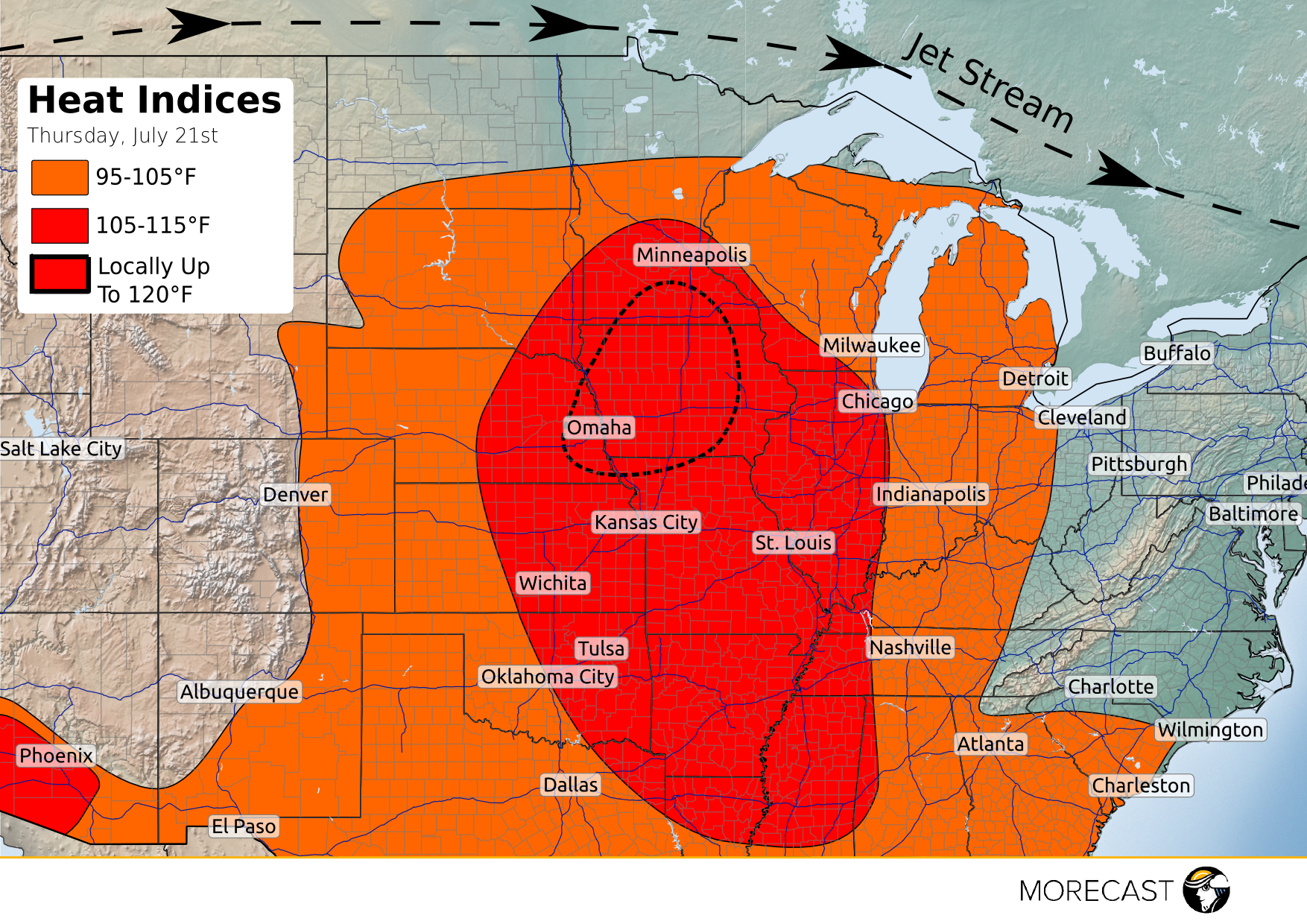 Dew points are expected to reach up into the low to mid 70’s as far north as North Dakota and Minnesota Thursday and Friday. Highs from Missouri to southern Minnesota will range from the 90’s to around 100°F, and the combination of the above average temperatures and dew points will result in a large area of heat indices of 105-115°F. Locally, heat indicies could approach 120°F for a time on Thursday, particularly over parts of Iowa.