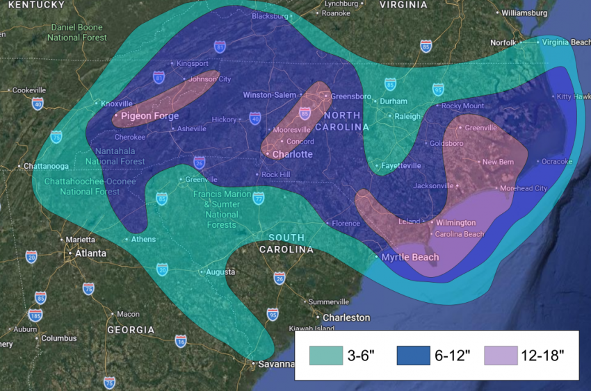 By far the heaviest snows have fallen across eastern Tennessee and North Carolina. Areas near the Blue Ridge Mountains saw accumulations of 6-12 inches (15-30 cm). Another heavy band dropped accumulations of 10-16 inches (25-40 cm) from the Charlotte metro area up to Greensboro, NC. The near-whiteout conditions led to 100-vehicle pile-up just north of Charlotte (see video above). After several hours the stranded motorists required rescue by the National Guard. A semi-truck became stuck in the snow at a railroad crossing and was slammed by a freight train, though fortunately there were no resulting injuries.