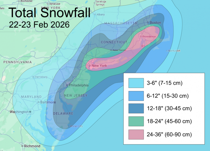 A powerful upper low moved through the Midwest and into the Mid-Atlantic on Sunday. This energy helped a surface low explode off the East Coast (see satellite loop above) which in turn pulled rich Atlantic moisture into a cold air mass over the Northeast. The result was widespread, very heavy snow bands dropping rates up to 2-3″ per hour. Philadelphia measured over 14 inches (36 cm), the highest amount since 2016. New York City saw 20-27 inches (50-69 cm), also the most since the big 2016 storm. Amounts up to 31 inches (79 cm) piled up further out on Long Island. The heaviest snows fell in Rhode Island and southeast Massachusetts with amounts of 27-36 inches (69-91 cm). Providence, RI shattered the previous all-time record with 33 inches (84 cm).