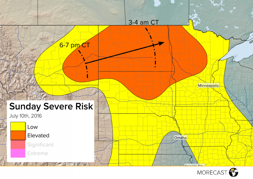 Conditions will become ripe for severe storm development later Sunday afternoon into the evening. A squall line of severe storms will likely develop this evening in eastern Montana and sprint across North Dakota tonight. Very large hail, isolated tornadoes, and strong winds will all be threats late this afternoon into this evening, with damaging straight-line winds becoming the predominant hazard overnight.