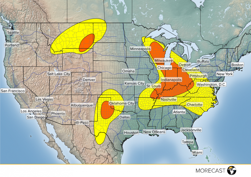 A storm system that brought hail, strong winds, and isolated tornadoes to the Upper Midwest on Tuesday will continue to push east into the Midwest, Lower Great Lakes, and South Central US on Wednesday. A warm front will move through the region through the afternoon hours, providing some good instability. During the afternoon, a cold front will approach from the west and help spark storms ahead of it. The major cities with the greatest threat of severe storms on Wednesday will be Milwaukee, Chicago, Indianapolis, Cincinnati, Louisville, Lexington, Nashville, and Memphis. The main threat from these storms will include wind gusts up to 65 mph, large hail up to 2″, isolated tornadoes, and localized flash flooding.