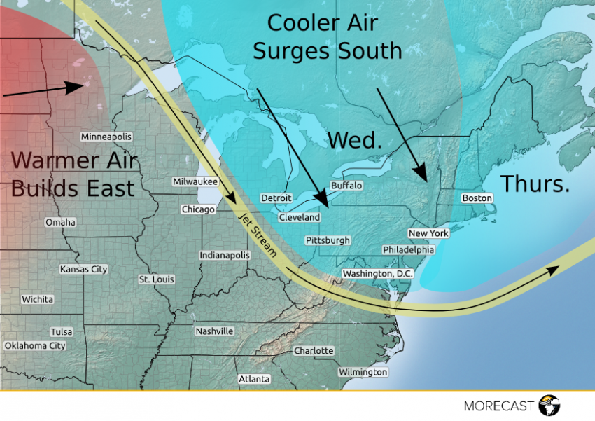 A dip in the jet stream across the eastern Great Lakes and the Northeast will open the door to a cool and blustery Canadian air mass that will bring a noticeable drop in temperatures to the area Wednesday and Thursday. Some will likely consider bringing along a sweater or light jacket on the way to work.