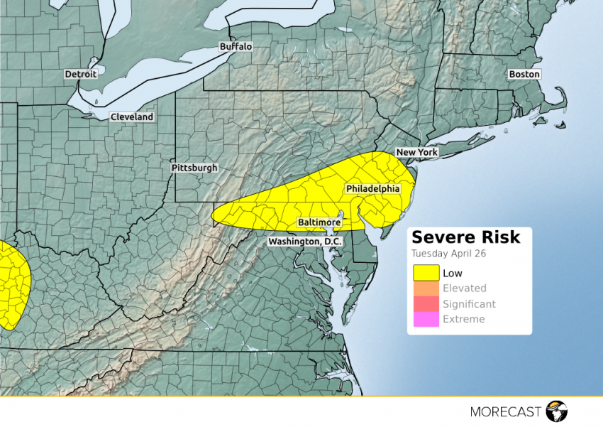 A cold front will move through the Mid Atlantic Tuesday afternoon, triggering scattered thunderstorms, a few of which may become severe.