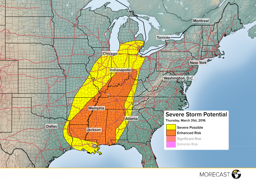 After numerous reports of hail, wind, and even a few tornadoes across central portions of the country on Wednesday, another round of severe weather is expected Thursday from the Lower and Middle Mississippi Valleys, eastward through the Ohio and Tennessee Valleys and Central Gulf Coast region. Destructive winds, large hail, and a few tornadoes will occur.